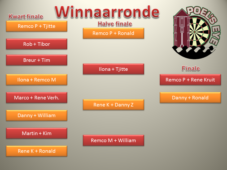 Rob Braam, Kim Fontaine en Breur hadden zich knap geplaatst voor de winnaarronde, maar zij wisten de halve finale niet te bereiken. Acht darters bereikten de halve finales wel. Voor Ilona van Emden, Tjitte Miedema, Remco Maarse en William Hunitetu bleek dit dan toch hun eindhalte. De finale ging uiteindelijk tussen Rene Kruit met Remco Pannekoek tegen Danny Zorn met Ronald Baars. Dit laatste koppel was favoriet. Danny won vorig jaar al het Blind Koppel Toernooi, Ronald won dit jaar voor de tweede keer op rij het ‘gewone’ Koppel Toernooi. Toch begonnen Rene en Remco beter, zij waren eerder op een dubbel. Na enige moeite vonden zij de juiste dubbel net op tijd. De tweede leg was het patroon precies hetzelfde, maar dan voor Danny en Ronald. Een ruime voorsprong ging bijna verloren, maar werd op tijd binnengehaald; 1 – 1. De derde leg miste Rene de Bull’s Eye bij een 130 rest score, waarna Danny en Ronald op voorsprong kwamen. De vierde leg had Danny bijna een 144 finish, na twee triples 20 miste hij dubbel 12. Omdat Rene en Remco de kans op de gelijkmaker niet wisten te benutten mocht Ronald terug komen om de wedstrijd te beslissen. Zodoende wonnen Danny en Ronald het Blind Koppel Toernooi. Rene en Remco konden desalniettemin tevreden terug kijken op dit toernooi. Beide koppels kregen prachtige bekers.