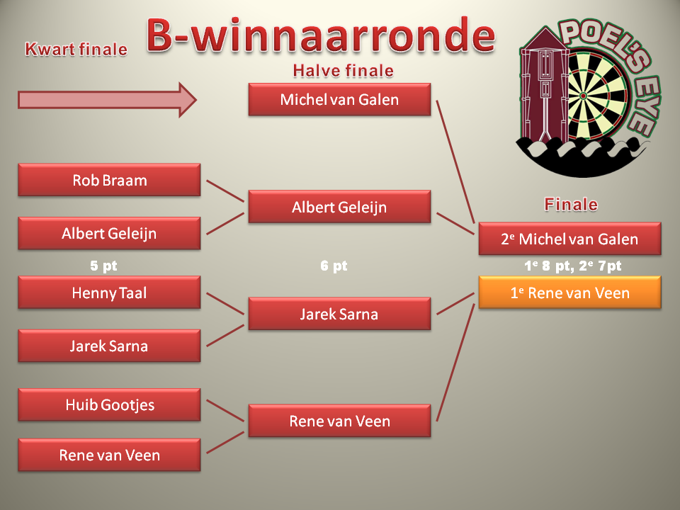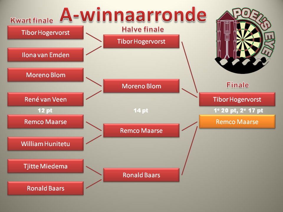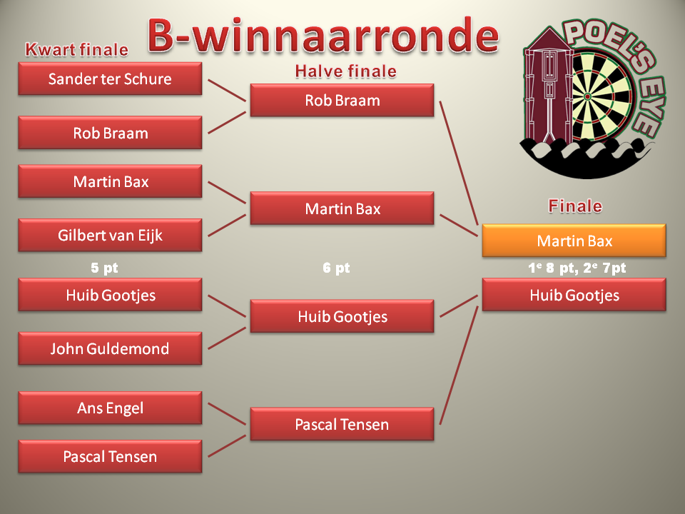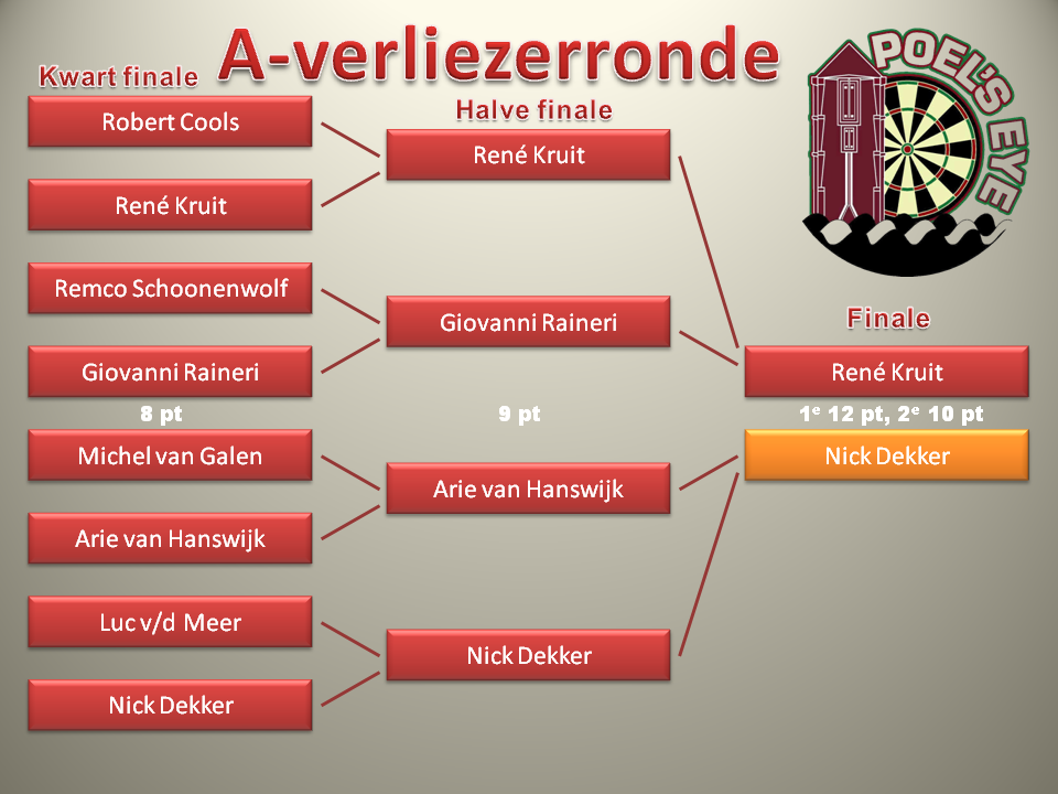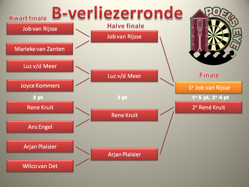 Volgende week is het tijd voor het eerste zaterdag toernooi van dit seizoen, namelijk de Open Kudelstaart. Wellicht komt Floor weer en weet ze haar stunt te herhalen van 2011 (winnares en Hoogste Uitgooi met 152). Marco Cornelisse is titel verdediger van de wisselbokaal, die hij nog wel zelf dient mee te nemen. De Open is 8 oktober, hopelijk bent u er dan ook. Elke darter kan zonder opgave vooraf meedoen, de Poel’s Eye is laagdrempelig en is geschikt voor alle niveaus; hoe meer zielen hoe meer vreugd. Jong, oud, man of vrouw, iedereen is welkom. De inschrijving sluit om 20.00 uur, deelname kost vier euro en de minimum leeftijd is 15 jaar.